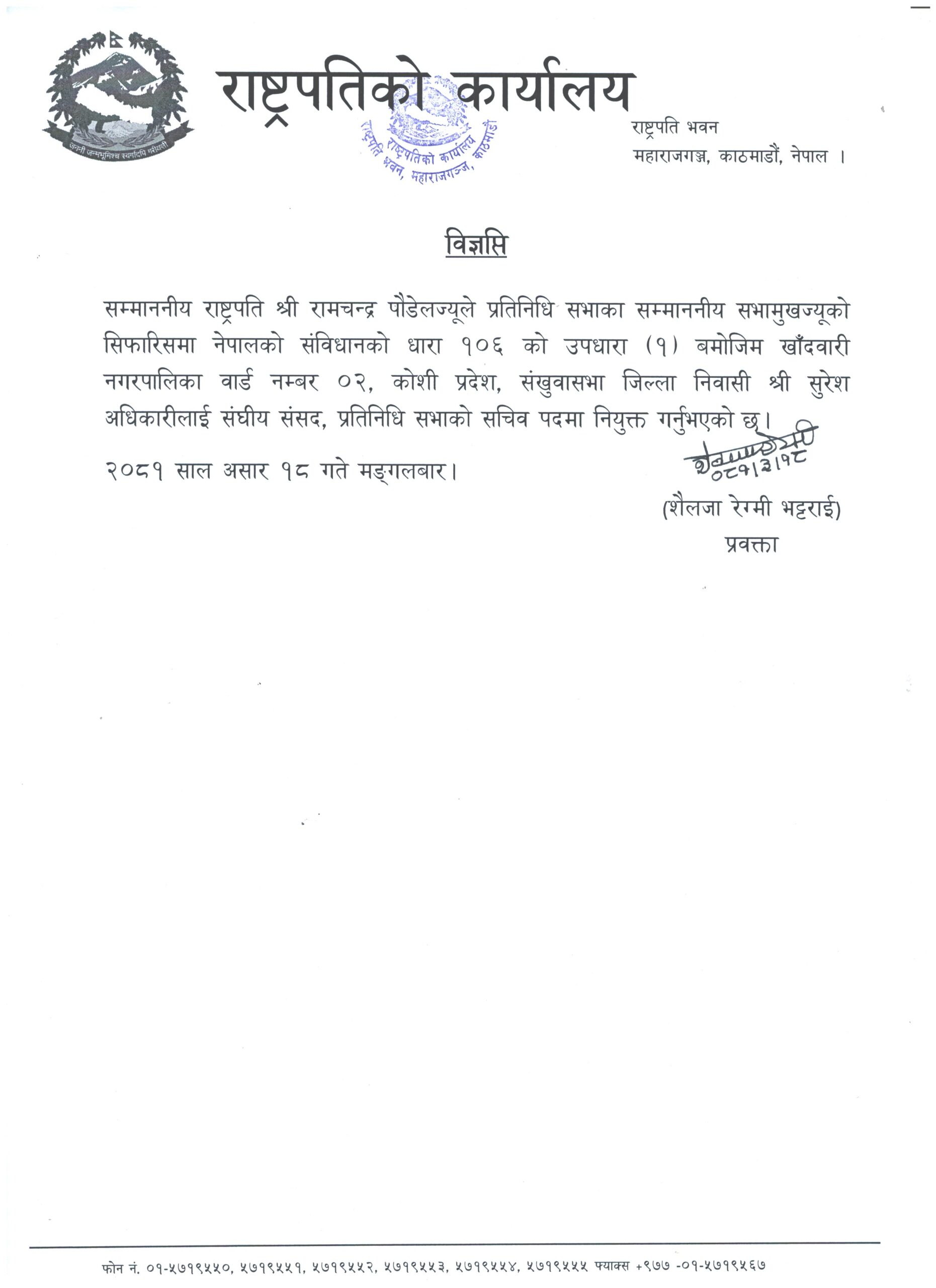 राष्ट्रपति रामचन्द्र पौडेलले संघीय संसद्अन्तर्गत प्रतिनिधिसभामा रिक्त सचिव पदमा सुरेश अधिकारीलाई नियुक्त गरेका छन् । मंगलबार राष्ट्रपति पौडेलले अधिकारीलाई सचिव पदमा नियुक्त गरेको राष्ट्रपति कार्यालयकी प्रवक्ता शैलजा रेग्मी भट्टराईले विज्ञप्तिमार्फत जानकारी गराएकी हुन् ।