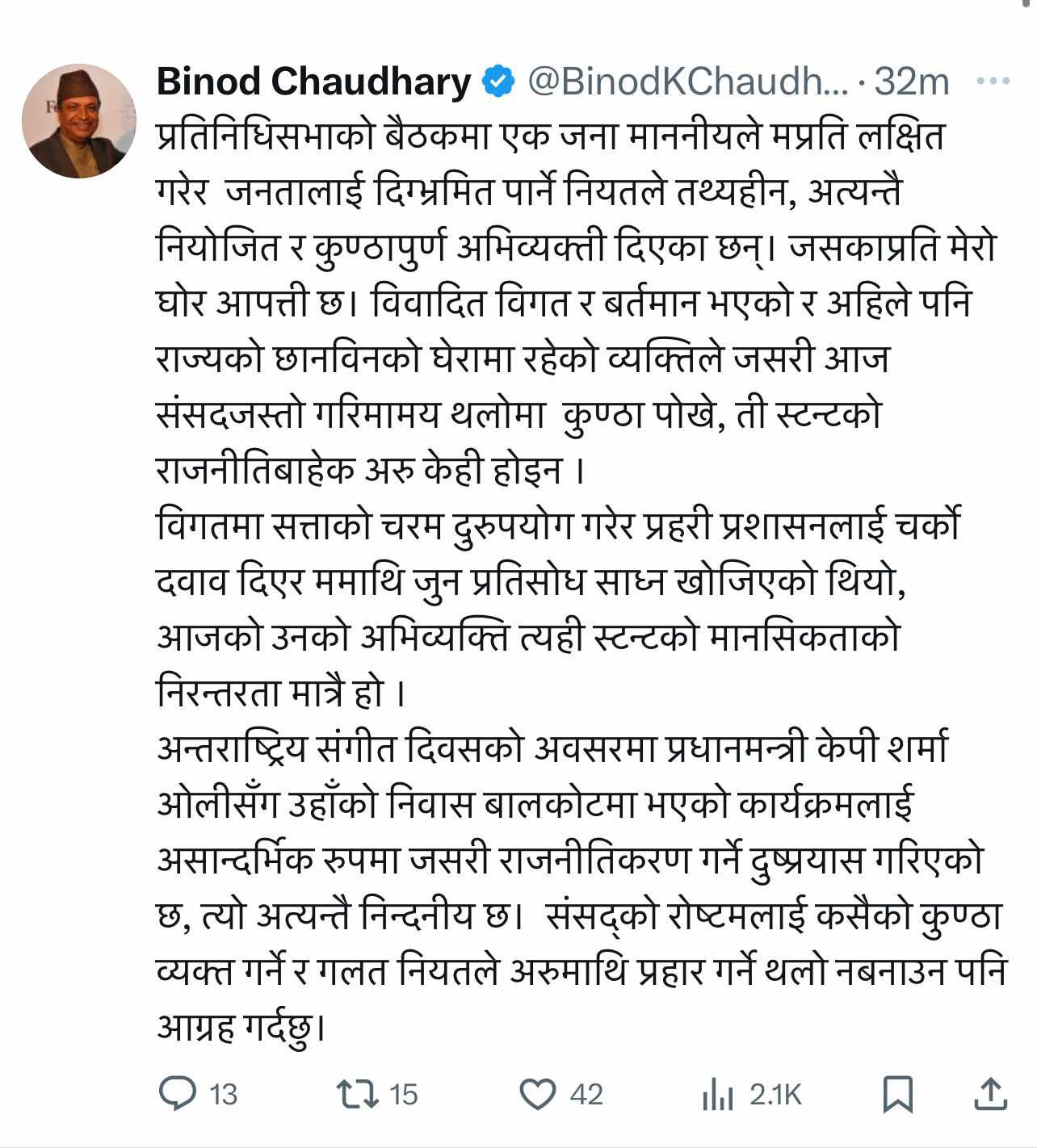 चौधरीले लेखेका छन्, ‘विवादित विगत र वर्तमान भएको र अहिले पनि राज्यको छानबिनको घेरामा रहेको व्यक्तिले जसरी संसदजस्तो गरिमामय थलोमा कुण्ठा पोखे, ती स्टन्टको राजनीतिबाहेक अरू केही होइन,’ ।