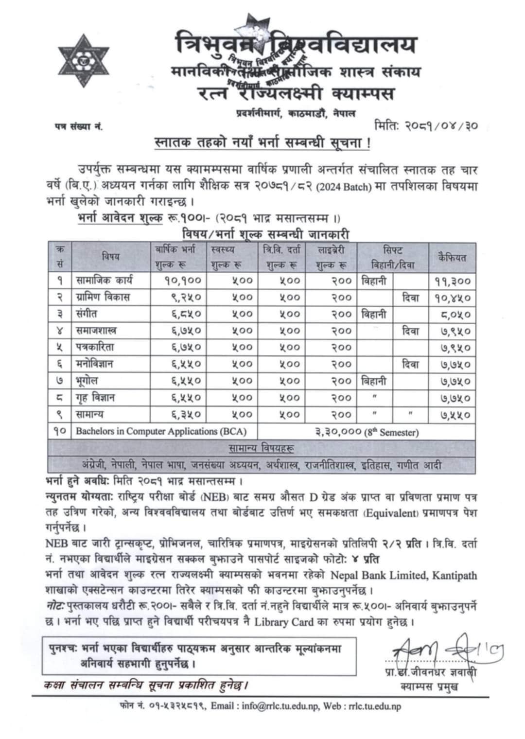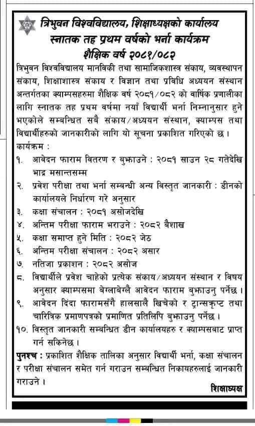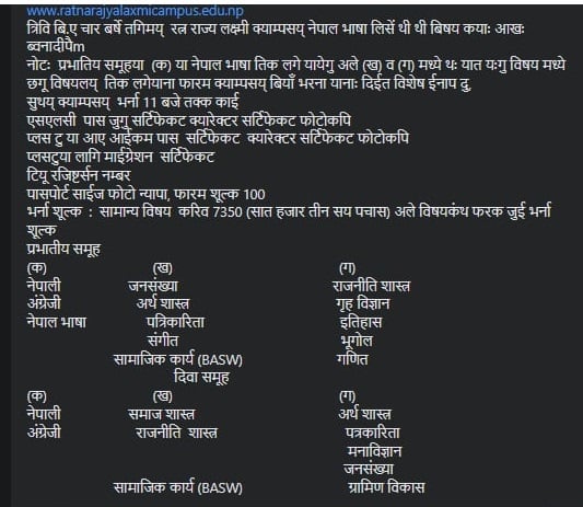 त्रिवि विश्व विद्यालय अन्तरगर्तका क्याम्पसरुमा वि.ए तहको प्रथम वर्षको भर्ना खुलेको जानकारी गराउदै काठमाडौंको प्रदर्शनसनी मार्ग अवस्थित रत्न राज्यलक्ष्मी क्याम्पस, बागबजारमा अवस्थित पद्यम कन्या क्याम्पस, ललितपुरको पाटन संयुक्त क्याम्पसमा गत श्रावण २८ गतेदेखि खुलेको बताए ।