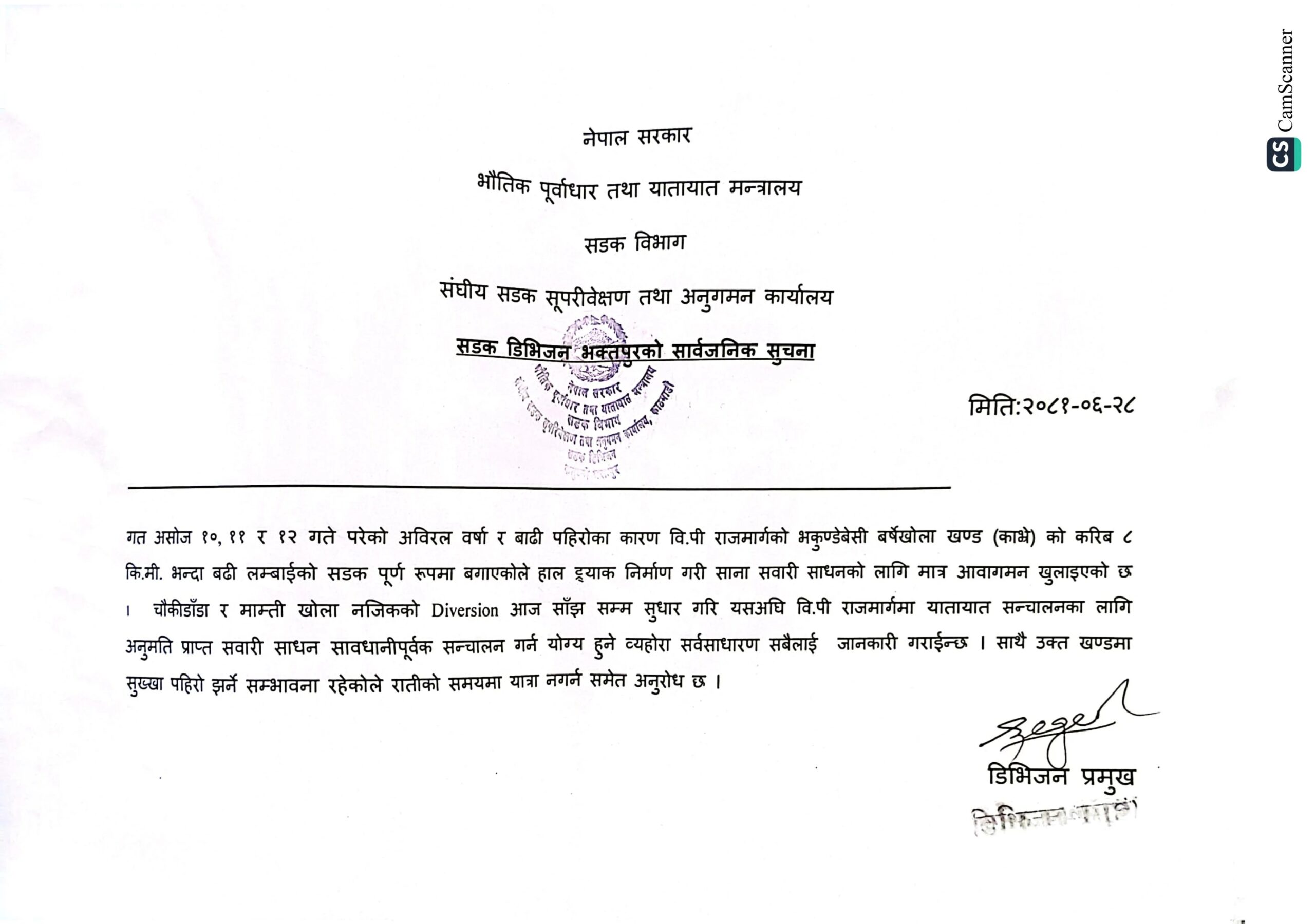 ठुला सवारीसाधन पास हुन अवरोध हुँदै आएको चौकीडाँडा र माम्ती खोला नजिकको डाइभर्सन आज साँझसम्म सुधार भइसक्ने र त्यसपछि सो सडकमा सञ्चालन अनुमति प्राप्त गरेका सबै प्रकारका सवारीसाधन सञ्चालन हुन सक्ने डिभिजनले जनाएको छ ।