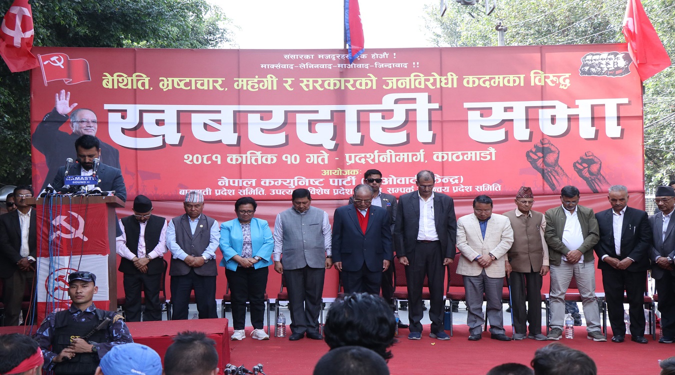 काठमाडौँ । नेकपा माओवादी केन्द्रले आज काठमाडौँमा खबरदारी सभा आयोजना गरेको छ । बर्तमान सरकारको सय दिन पूर्णतः असफल रहेको निष्कर्ष निकालेको माओवादीले काठमाडौँमा खबरदारी सभा गरेको हो । कार्यक्रम बागमती प्रदेश, उपत्यका विशेष र सम्पर्क समन्वय समितिको संयुक्त आयोजनामा भएको हो । काठमाडौँ मलमा नेता तथा कार्यकर्ताहरू जम्मा भई त्यहाँबाट बाजा, झाँकीसहित ब्यानरको नेतृत्व अध्यक्ष पुष्पकमल दाहाल ‘प्रचण्ड’सहित पदाधिकारीले गरेका छन् । जुलुस भद्रकाली, सहिद गेट हुँदै काठमाडौँ मलमा जम्मा भई रत्नपार्क, बागबजार, प्रदर्शनी मार्ग हुँदै भृकुटीमण्डपमा आएर खबरदारी सभामा परिणत भएको थियो । कार्यक्रमलाई सम्बोधन गर्दै माओवादी केन्द्रका उपाध्यक्ष अग्नि सापकोटाले वर्तमान सरकार दलाल बिचौलियाले बनाएको पुष्टि भएको बताएका छन् ।