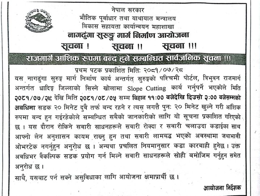 नागढुंगा सुरुङ मार्गको पश्चिमी पोर्टल अन्तर्गत धादिङ जिल्लाको सिस्ने खोला क्षेत्रमा बिहीबारदेखि राजमार्ग आंशिक रुपमा बन्द गरिने भएको छ । नागढुंगा सुरुङ मार्ग निर्माण आयोजनाले बुधबार एक सूचना जारी गर्दै बिहीबार (२९ कात्तिक) देखि ५ मंसिरसम्म बिहान ११ बजेदेखि दिउँसो २ बजेसम्म आंशिक रूपमा सडक बन्द गरिने भएको छ ।