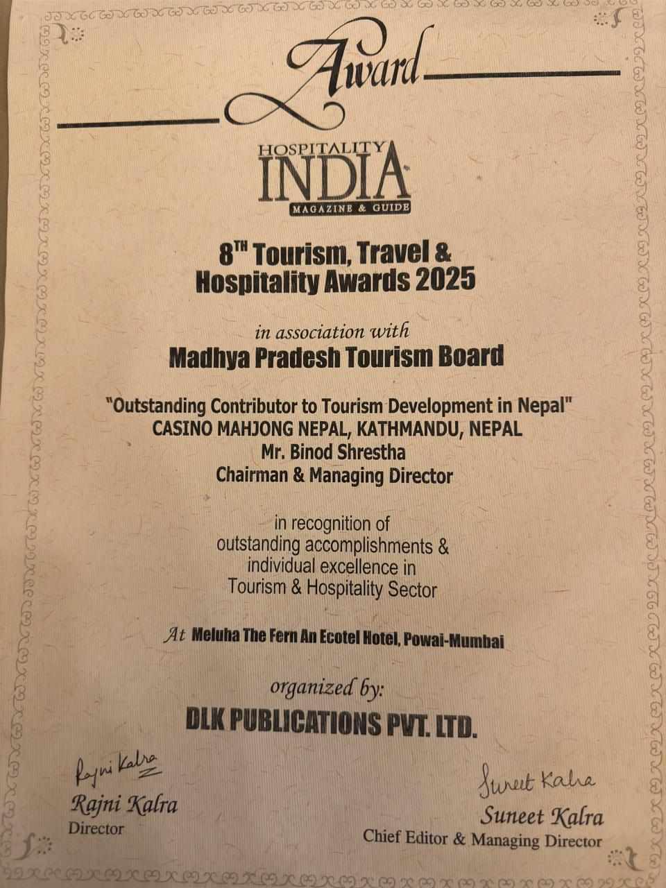 काठमाडौंस्थित सोल्टी होटल परिसरमा रहेको क्यासिनो माजोङ, नेपाल भारतको मुम्बईस्थित MELUHA “THE FERN” होटलमा आयोजित आठौं हस्पिटालिटी इन्डिया ट्राभल अवार्ड कार्यक्रममा दोस्रोपटक “Outstanding Contributor to Tourism Development in Nepal” अवार्डबाट सम्मानित भएको छ ।