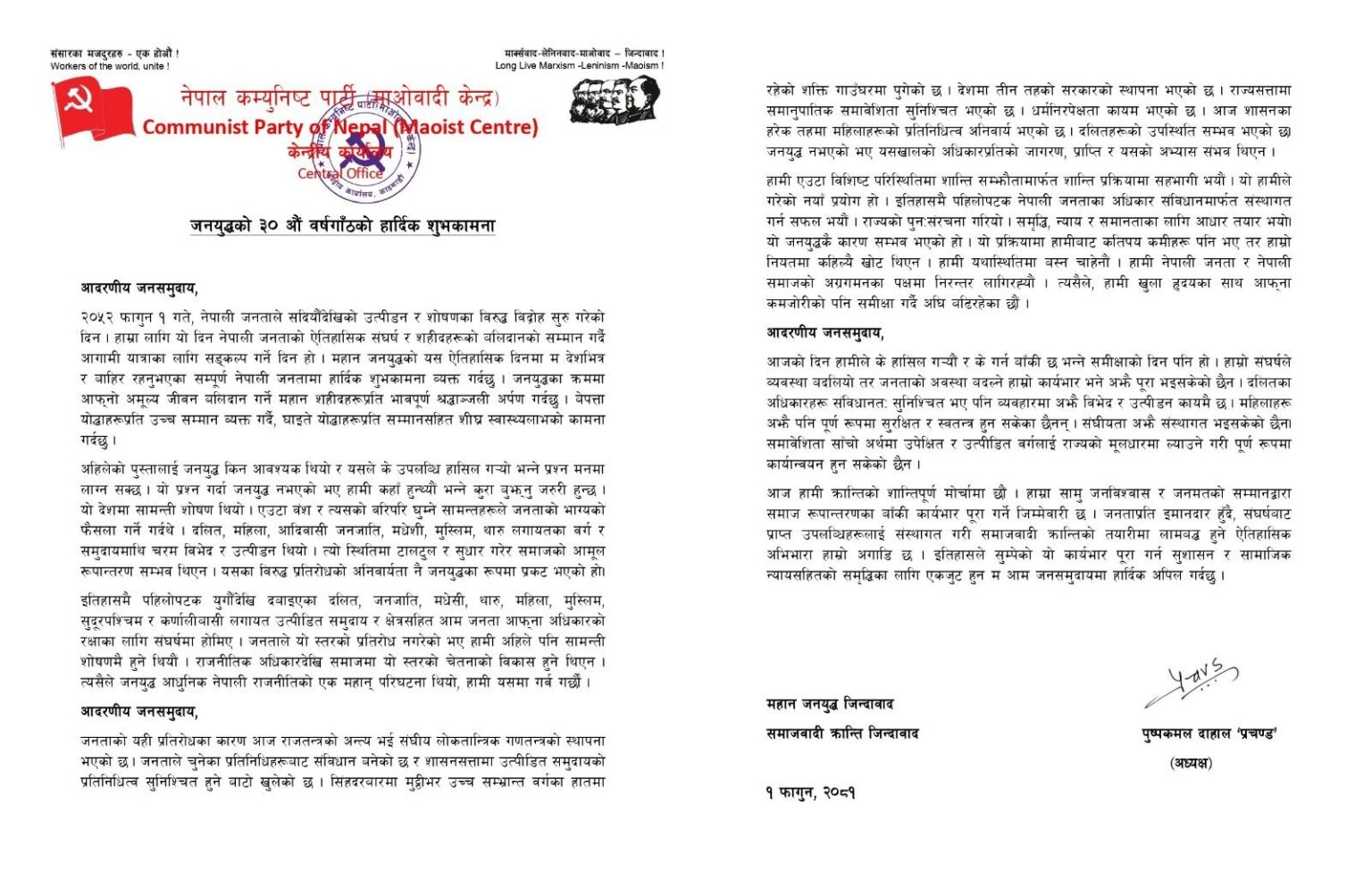 २०५२ साल फागुन १ गतेलाई नेपाली जनताले सदियौँदेखिको उत्पीडन र शोषणका विरुद्ध विद्रोह सुरु गरेको दिन भनेर स्मरण गर्दै दाहालले नेपाली जनताको ऐतिहासिक संघर्ष र शहीदहरूको बलिदानको सम्मान गर्दै आगामी यात्राका लागि सङ्कल्प गर्ने दिन भएको जनाएका छन् ।