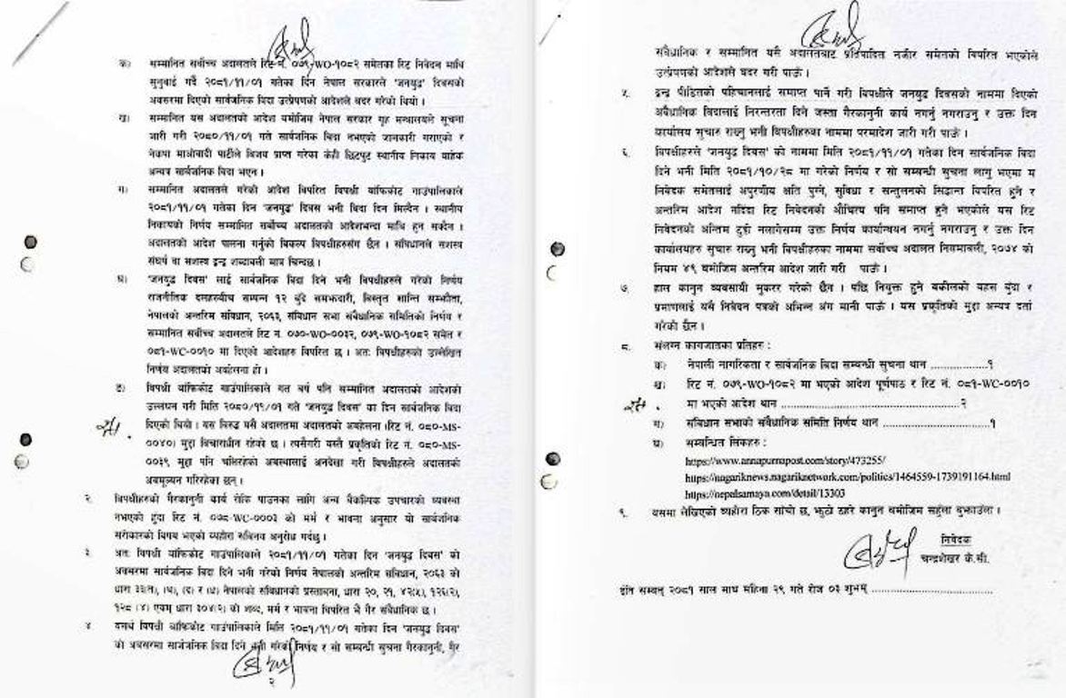 केसीले हत्या हिंसालाई जनयुद्धको उपमा दिइएको निवेदनमा उल्लेख गरेका थिए । रिट निवेदनमा उनले माओवादी हिंसाबाट पीडित रहेको उल्लेख गर्दै यसअघि सर्वोच्चबाट भएका आदेशलाई नजिर मानेर फागुन १ गतेको सार्वजनिक बिदा गैरकानुनी भएको दाबी गरेका थिए।
