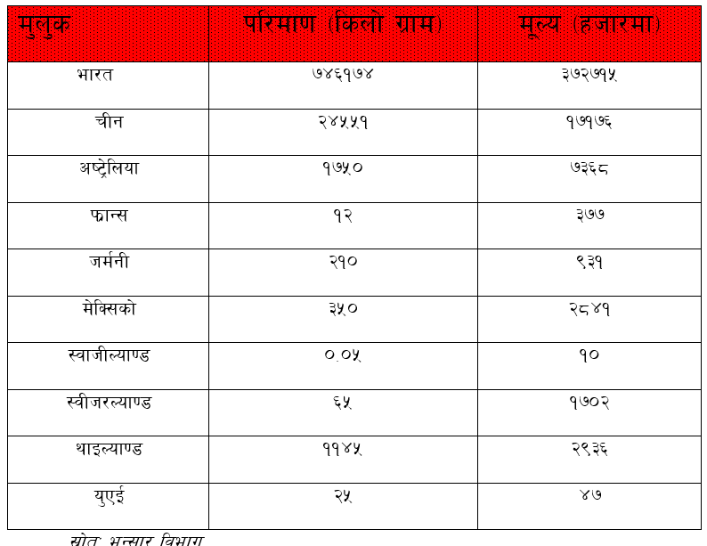 साथै सो अवधिमा ८३ लाख ३१ हजार रुपैयाँको ४१२४१ किलो सिन्दूर आयात भएको विभागको तथ्याङ्कमा उल्लेख छ ।