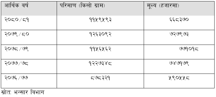 यसैगरी २०७७/७८ मा ७४ करोड ७१ लाख ७९ हजार रुपैयाँ बराबरको आयात भएकोछ भने २०७६/७७ मा ५९ करोड ५ लाख ५८ हजार रुपैयाँको रङ आयात भएको छ ।