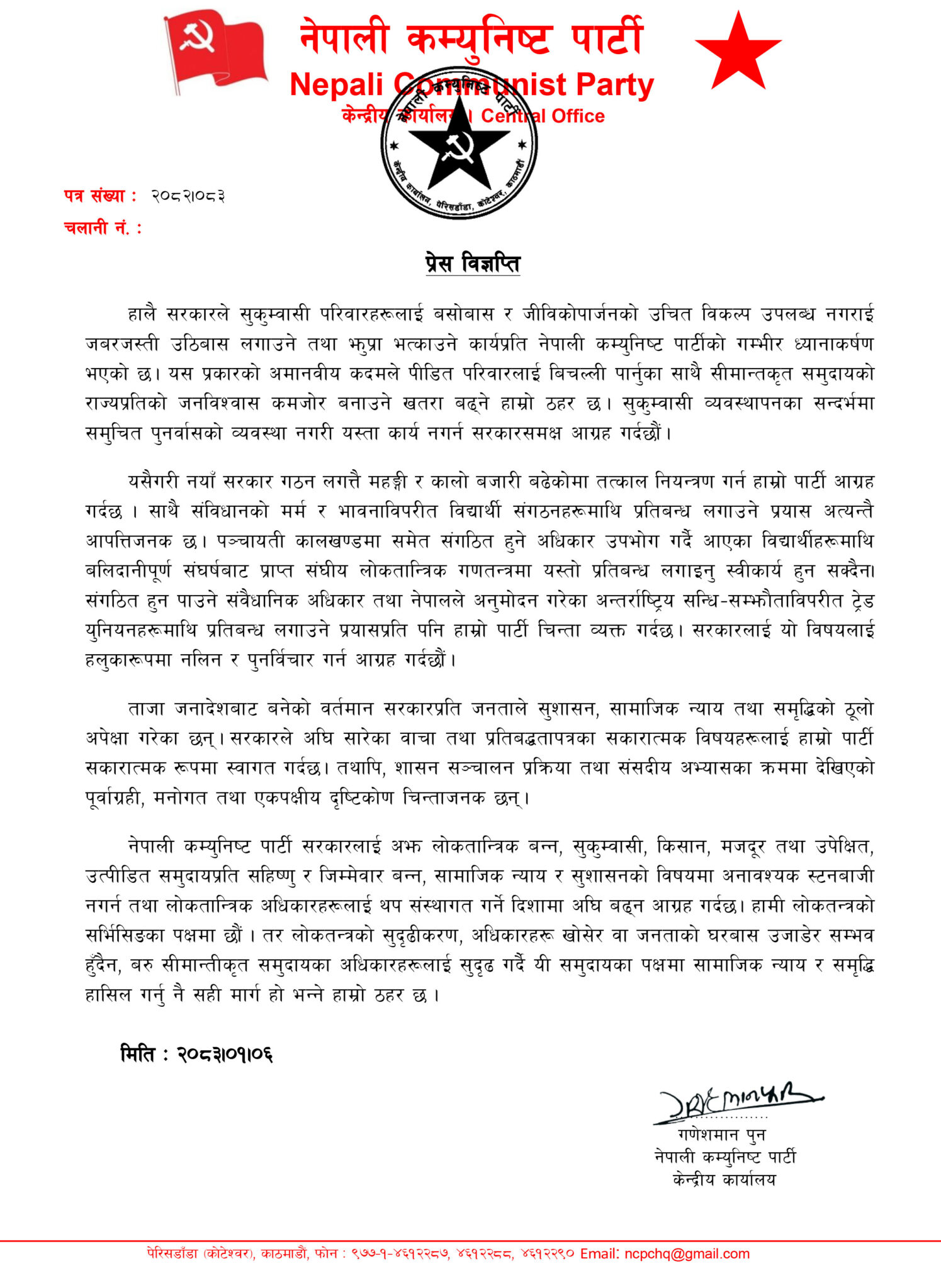 नेपाली कम्युनिस्ट पार्टीले सरकारको हालको कार्यशैलीप्रति गम्भीर आपत्ति जनाउँदै सुकुम्बासी व्यवस्थापन, विद्यार्थी अधिकार र शासन सञ्चालनबारे ध्यानाकर्षण गराएको छ। आइतबार प्रेस विज्ञप्ति जारी गर्दै सुकुम्बासी परिवारलाई उचित विकल्प बिना जबरजस्ती उठिबास लगाउने तथा बस्ती भत्काउने कार्य अमानवीय भएको उल्लेख गरेको छ।